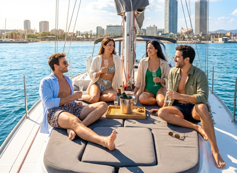 Rent this wonderful boat for 12 people in Barcelona Port Olímpic for corporate events, bachelorette parties, birthdays, meals on board… anything is possible on this fantastic 13.5-meter-long boat where you’ll enjoy sailing in comfort and spaciousness. You can eat, sunbathe, and even dance on board!